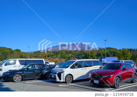 山梨県北杜市の八ヶ岳PA(下り)から駐車両越しに北側の八ヶ岳連峰を見る
