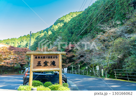 岐阜県八百津町 剣豪宮本武蔵が修行したと言われる伝説がある秋の五宝滝へ向かう駐車場の看板