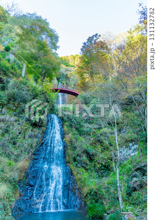 岐阜県八百津町 剣豪宮本武蔵が修行したと言われる伝説がある秋の五宝滝の赤い橋を渡る人