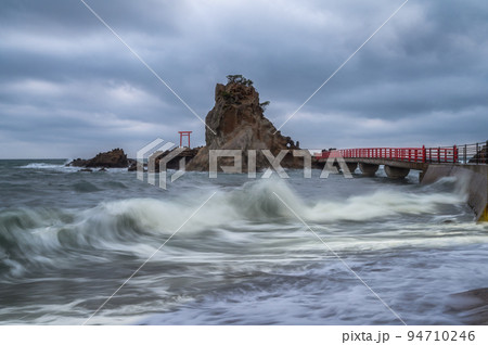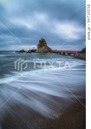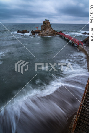 福島県いわき市 曇天の八立海岸弁天島の朝