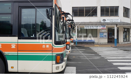 バスターミナルで出発を待つバス