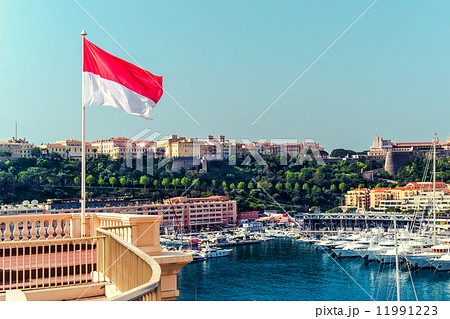 National flag of of the Principality of Monaco and view of port