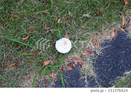 公園の芝生に生える白いキノコ(オオシロカラカサタケ)