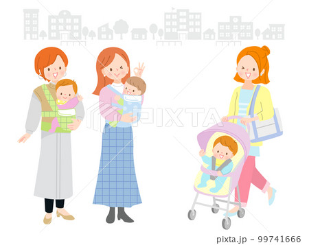 同い年くらいの赤ちゃんを抱っこしたお母さん、ママ友のイラストレーション