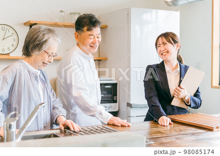 住宅展示場・モデルルーム・ハウスメーカーで高齢者夫婦に説明するビジネスウーマン(キッチン・天板)