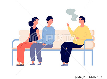 Smoking in public place. Man smoker, couple are passive smokers. Drug or nicotine addiction, people with bad habit. Relaxed guy vector character