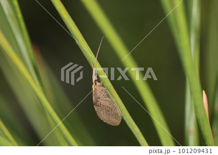 生き物 昆虫 ヤマトヒメカゲロウ、体長十六ミリほど。背中の淡い色、模様の無い半透明の翅