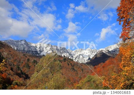 六十里越雪割り街道の紅葉と初冠雪した浅草岳