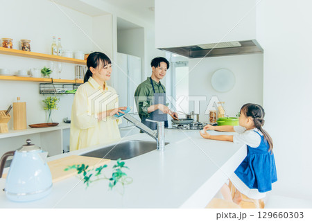 キッチンで料理をする家族