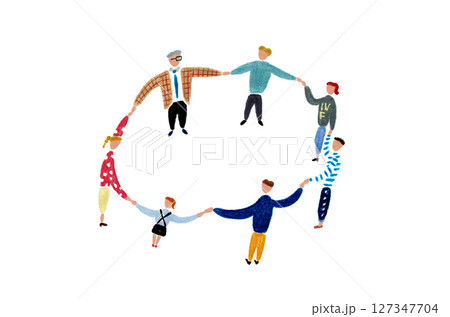 手描きイラスト ハートの輪になって手をつなぐ男性と女性と子供