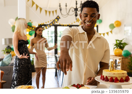 Serving cake at birthday party, man with friends celebrating in background