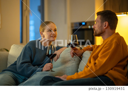 Romantic evening with wine under low light couple talking in intimate living room. Couple talking