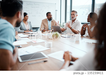 Business people, meeting and marketing strategy in team planning or sharing ideas at office. Group of employees in teamwork, collaboration or brainstorming for market plan or project at conference