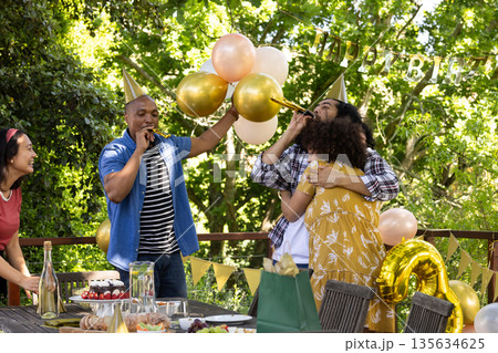 Celebrating birthday outdoors, friends with balloons and party hats having fun