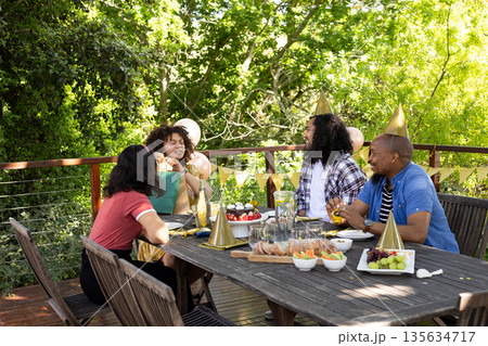 African American family sharing meal outdoors, laughing and talking together