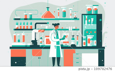 Scientist white coat white clear laboratory glassware experiment equipment chemistry biology medical technology innovation data analysis academic clinical modern clean workspace confident expression