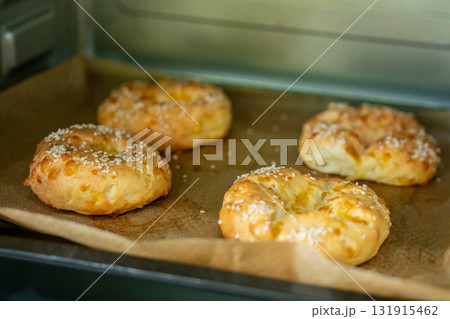 Bagels, Pretzels, Sesame, freshly baked golden cheese bagels with white sesame seeds on parchment paper in an oven tray, a delicious homemade snack.