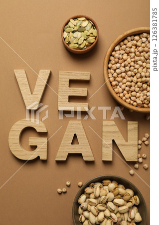 Nuts and seeds in bowls and wooden letters on beige background, top view