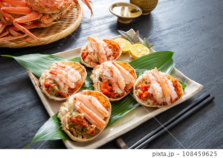 花咲ガニの剥いた身が黒い皿の上に並んでいる。甲羅に身を盛り付けている。