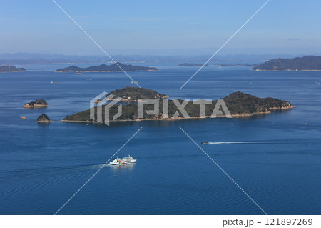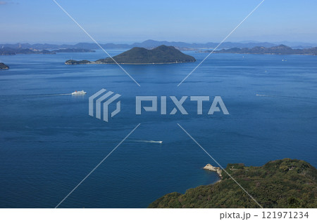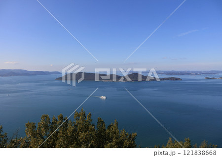 瀬戸内海に突き出した屋島の先端「長崎の鼻」と男木島、豊島、直島、小豆島フェリー