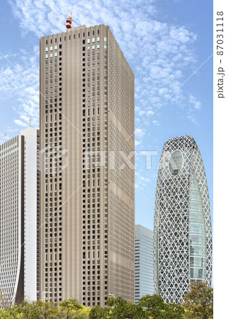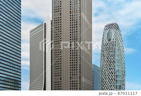 [東京・新宿] ビジネスと経済を象徴する西新宿のビル群のファサードのクローズアップ。