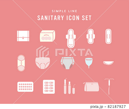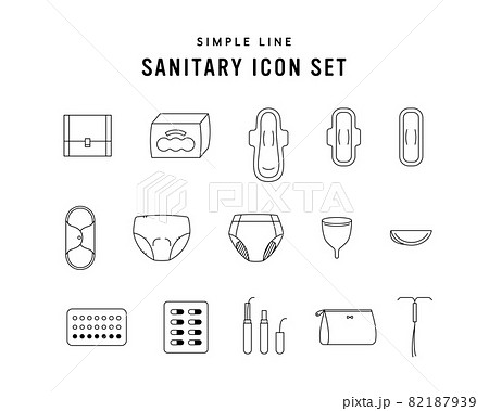 サニタリー用品のアイコンのセット シンプル 月経 生理用品 ナプキン タンポン ショーツ ピル
