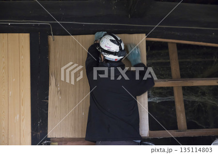 古民家解体工事イメージ 壁を剥がす男性作業員