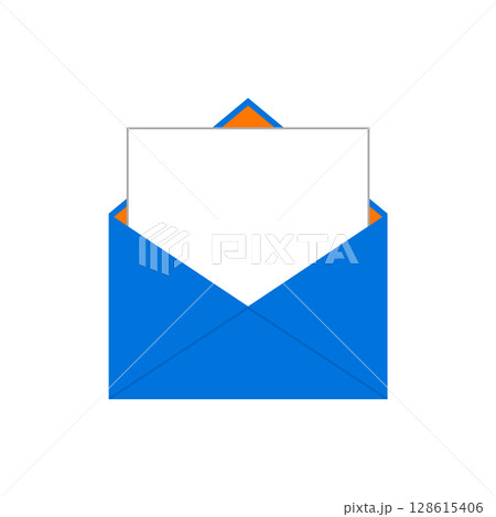 Unfolded postal blue envelope with blank white sheet inside. Empty white letter. Isolated vector illustration on white background.