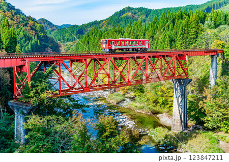 紅葉と赤い鉄橋を渡る秋田内陸線