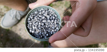 Close-up, high-angle shot of a container filled with silver airgun pellets, held carefully in two human hands outdoors. Shallow depth of field blurs the background