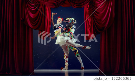 Theater dialogue. Mime and ballerina performing expressive motion in red curtain frame.
