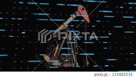 Showing oil pump jack with red horsehead, beam, ladder against void, scanning blue data bars
