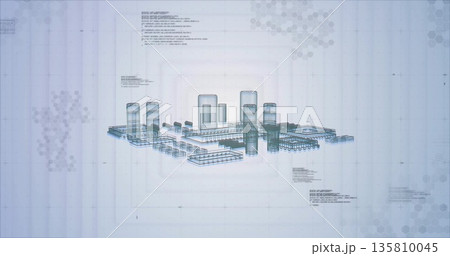 Rendering wireframe model showing plant layout on grid interface, with tanks columns and piping