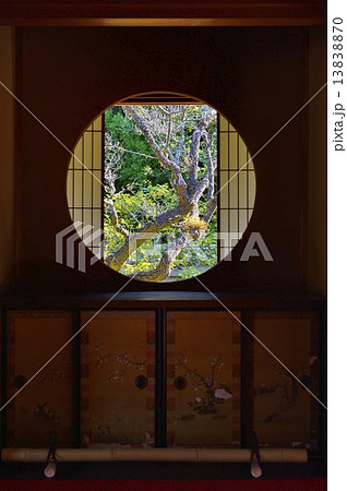 秋の京都 妙覺寺(妙覚寺) 円窓から見える風情ある庭と石像