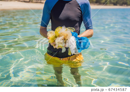 Man collects packages from the beautiful turquoise sea. Paradise beach pollution. Problem of spilled rubbish trash garbage on the beach sand caused by man-made pollution and environmental, campaign to