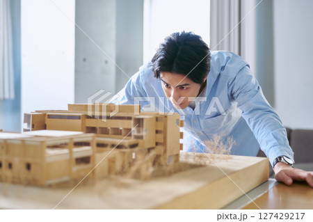 建築模型を見て建物の条件や予算を分析しプランニングをする1人の男性