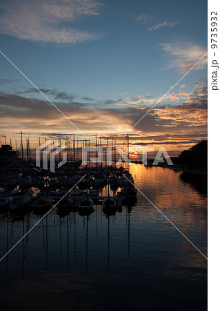 Yachts in harbor with sunset