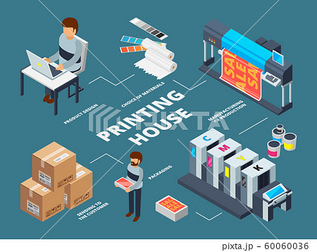 Printing house industry. Plotter inkjet offset machines commercial digital documents production vector isometric pictures