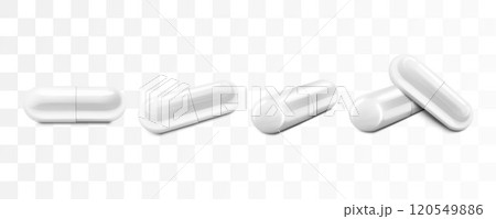 White Medical Pills or Capsules close up, isolated on transparent background. Capsules for Graphics, Mockup. Medical and Healthcare Concept. Vector 3d Realistic illustration