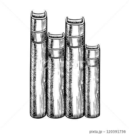 A stack of standing books, rear view, book spines. Vector black and white graphics. Hand-drawn illustration on a white background. For postcards, flyers, posters. Posters, flyers, banners and more.