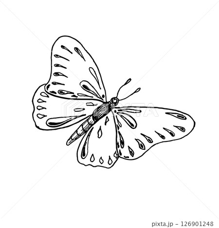 Butterfly hand drawn black and white outline vector illustration. Graceful insect as butterfly Monarch , Morpho or Painted Lady line art sketch for vintage prints, botanical and elegant nature decor.