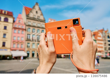 Close-up of woman holding an orange camera in picturesque European square, with colorful buildings in background. Female tourist walking in city. Summer travel concept