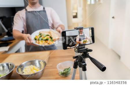 The chef is broadcasting live from workshop how to prepare a vegetarian food