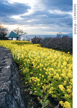 吾妻山公園の菜の花畑と朝焼けと三角屋根