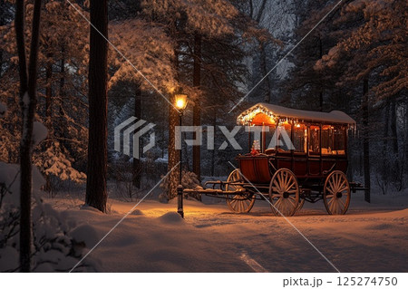 Enchanting Christmas carriage illuminated by festive lights in a snowy forest at night