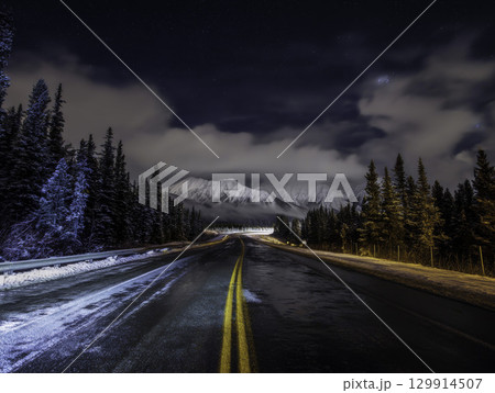Night scenic road in winter forest leading to snowy mountains beneath starry sky and dramatic clouds, peaceful landscape travel concept