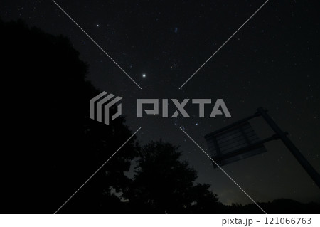 北杜市白州町、神無月の夜明け間近、中天高く昇る木星と冬の大六角