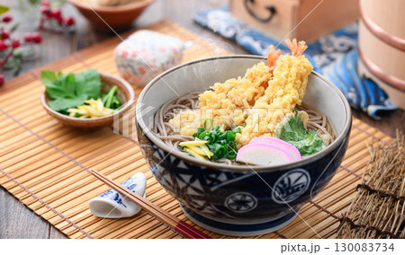 湯気立つ熱々の天ぷら蕎麦 年越しそばや冬の和食イメージにぴったりのあたたかい和食料理