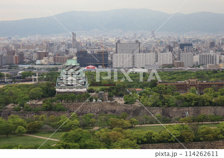 空から眺める大阪城鳥瞰図 桜の季節 生駒山系 春の青空に映える満開の桜