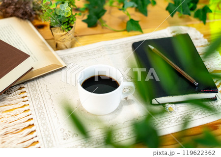 テーブルの上のコーヒーと本